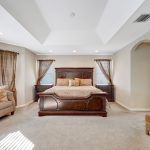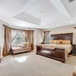 The master bedroom suite serves as a luxurious retreat, showcasing a tray ceiling, private sitting room, balcony, and a lavish ensuite bathroom with his and her sinks, a soaking tub, and a separate shower. French doors provide versatility, allowing the sitting room to be utilized as a nursery or home office.
